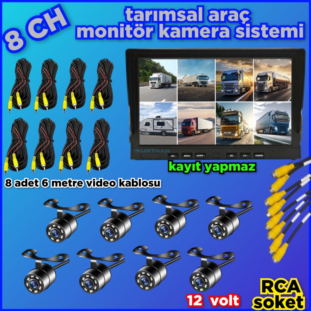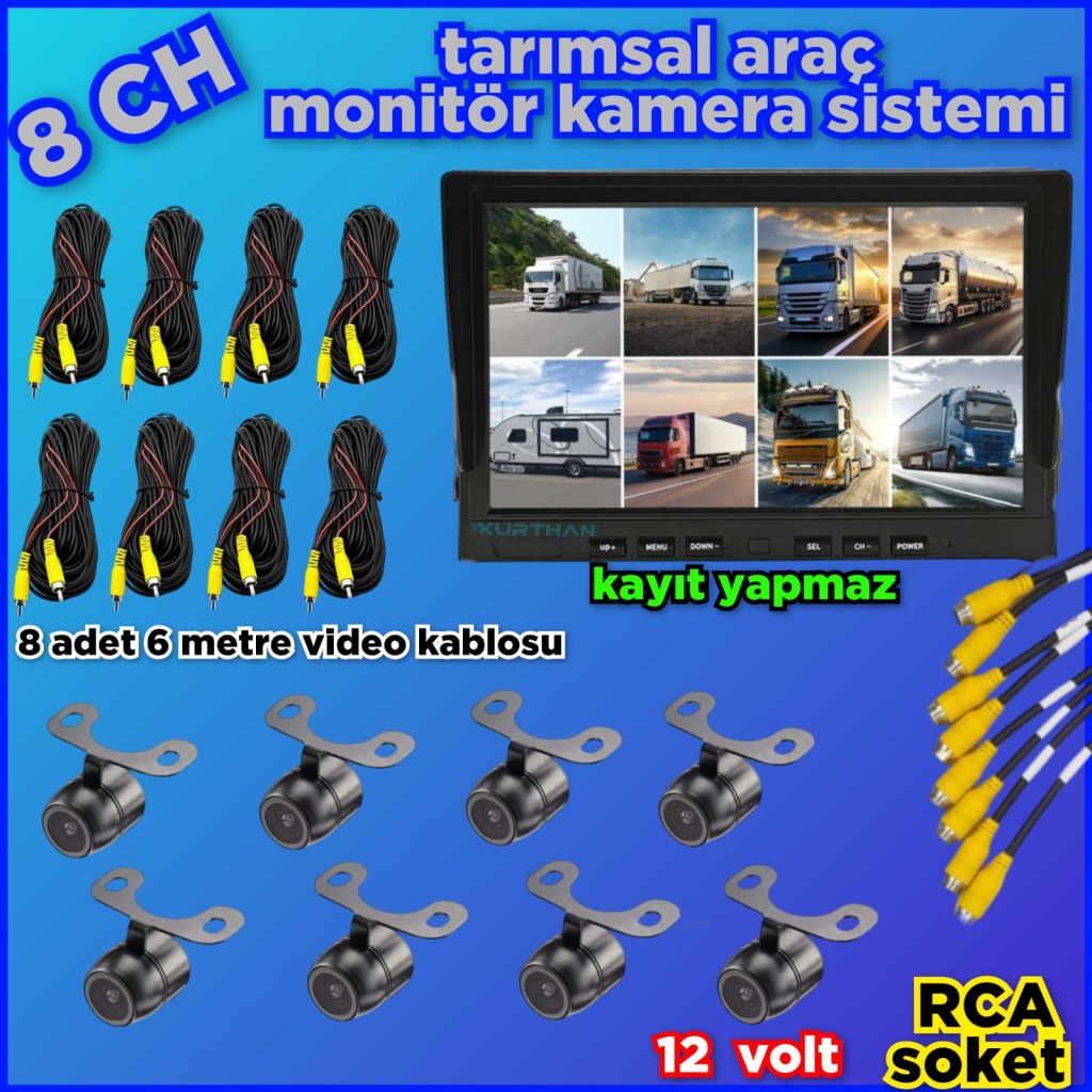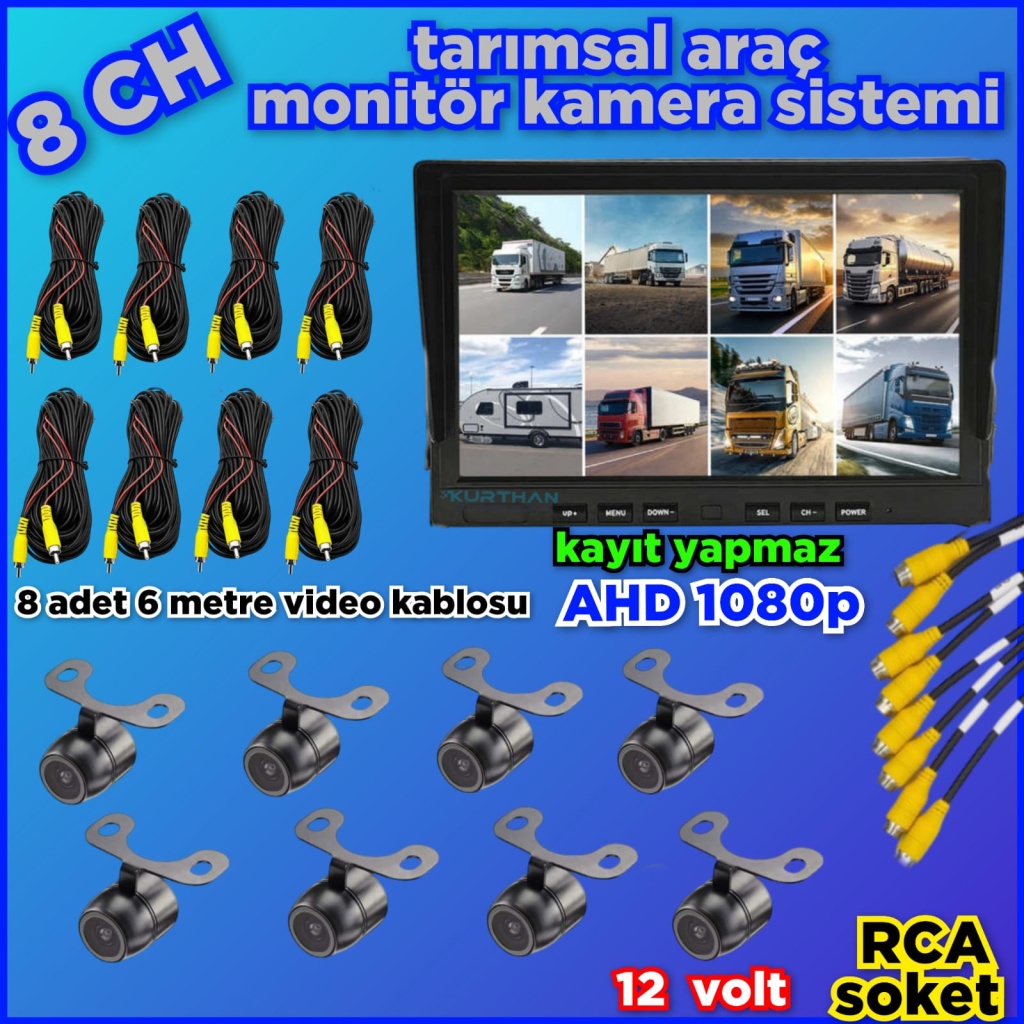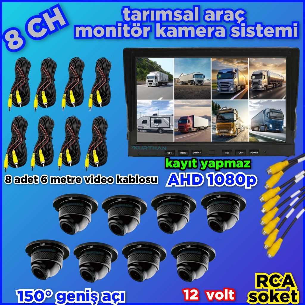8 KANALLI MONİTÖR VE 8 ADET 1080 P AHD 180 DERECE BALIK GÖZÜ KAMERA SETİ 12 V