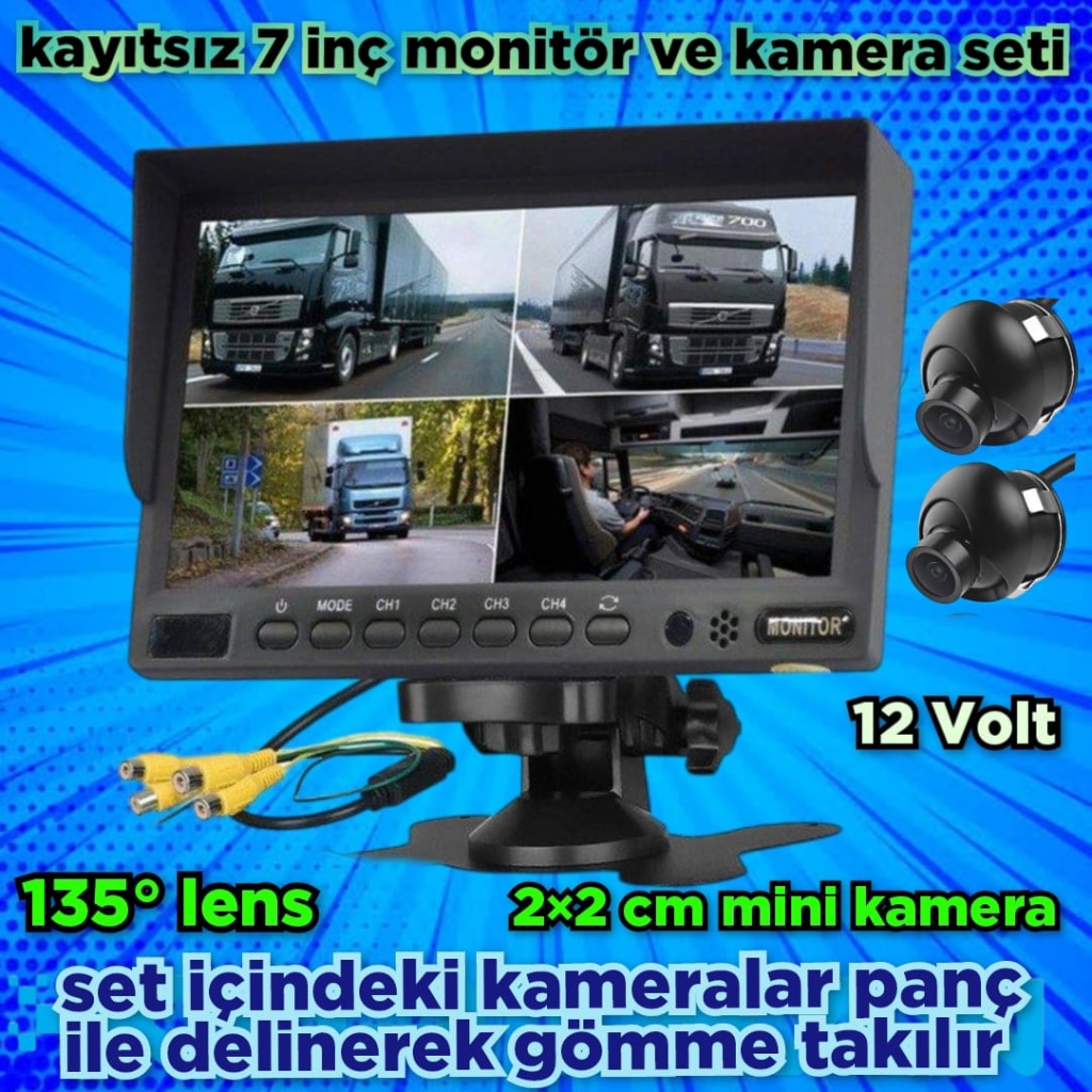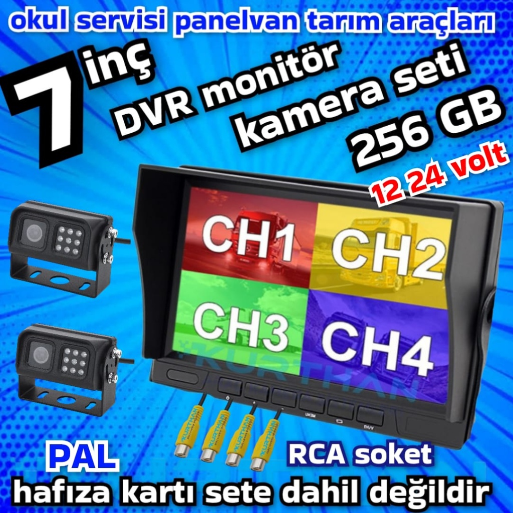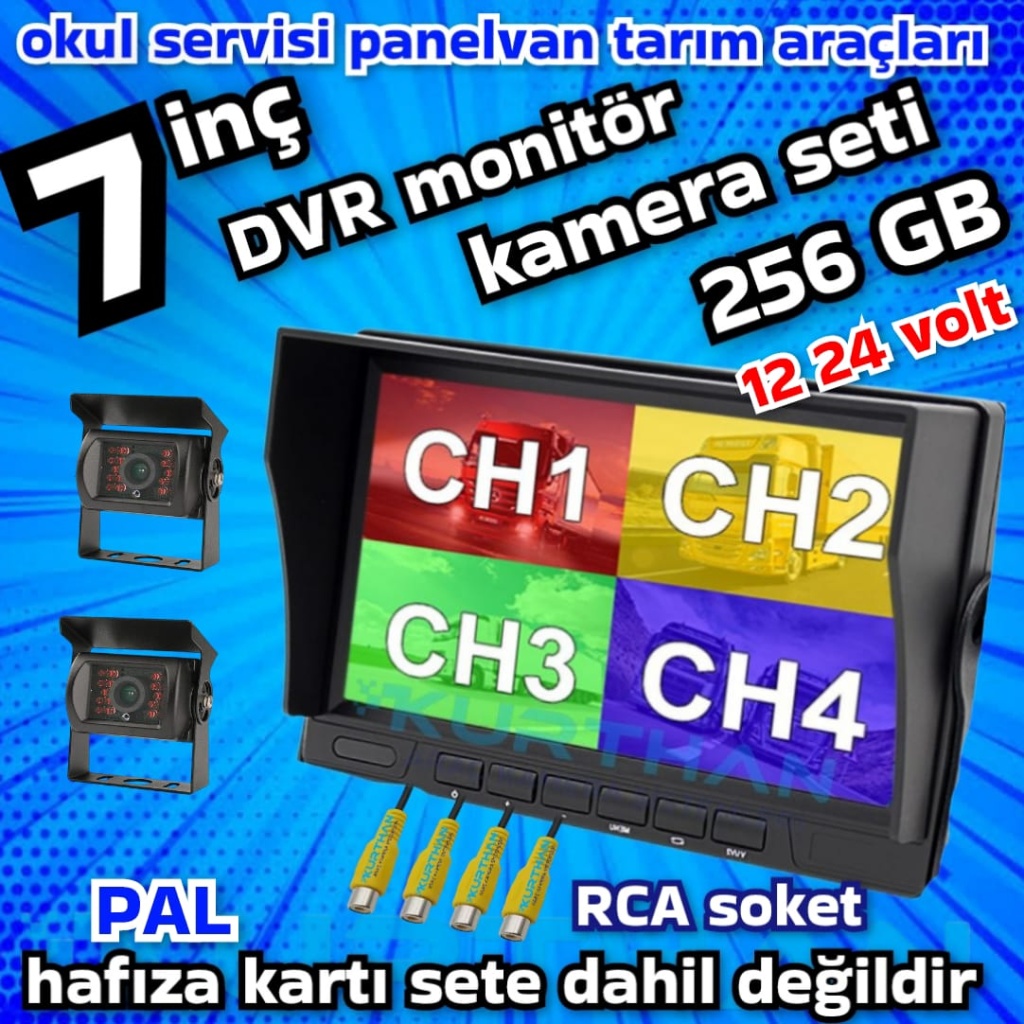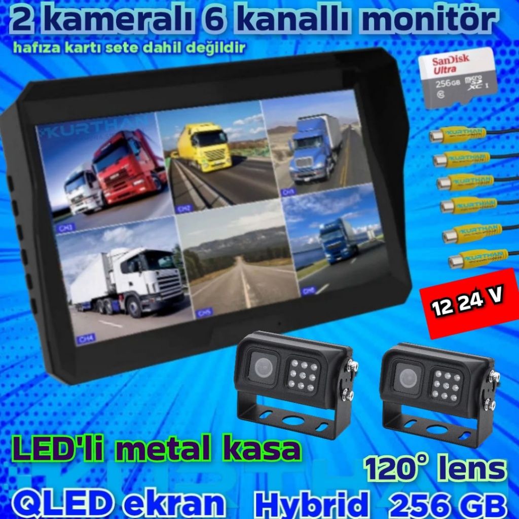 2 ADET ŞAPKALI METAL KASA LEDLİ KAMERA 7 İNÇ HYBRİD 4 KANALLI 256 GB DVR MONİTÖR 12*24 VOLT