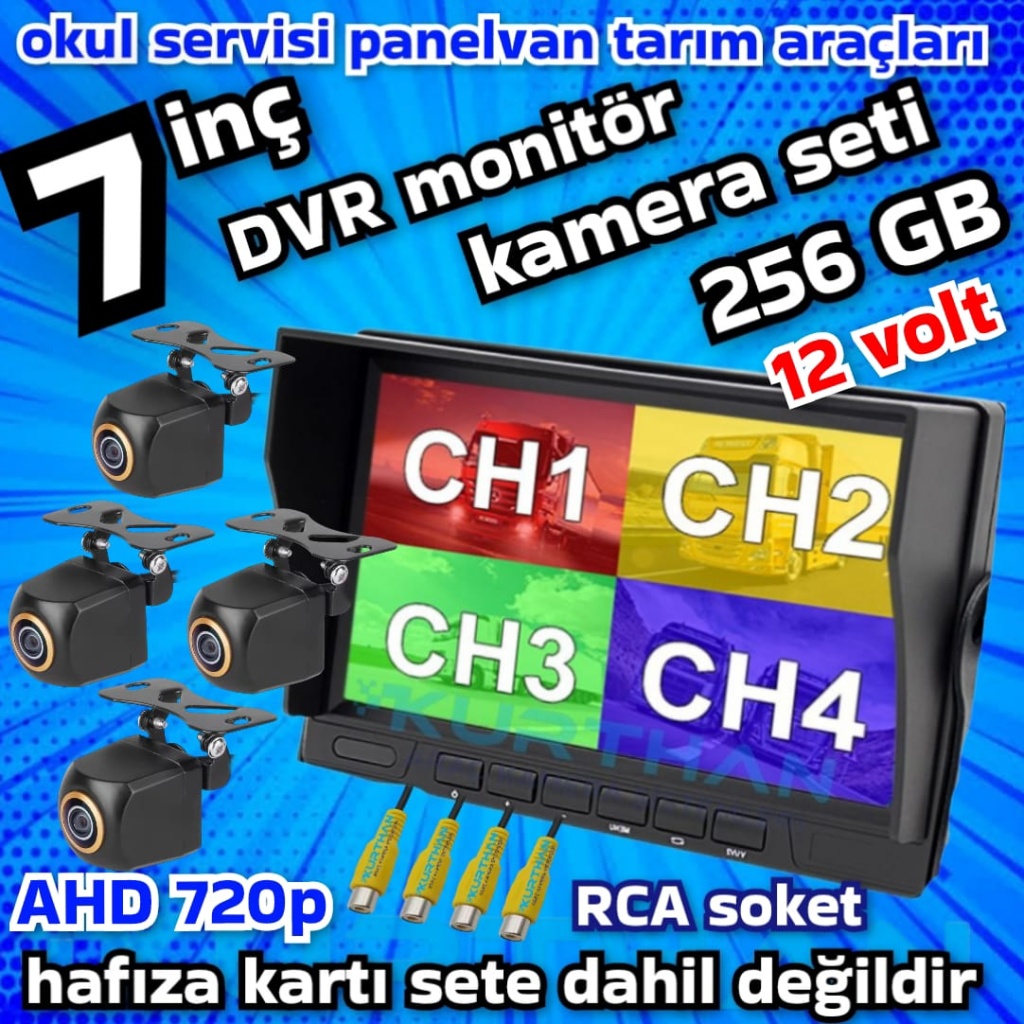 4 AHD 720P 170 DERECE GENİŞ AÇILI BALIK GÖZÜ KAMERA 7 İNÇ 256 GB QLED DVR MONİTÖR SETİ – 12 VOLT