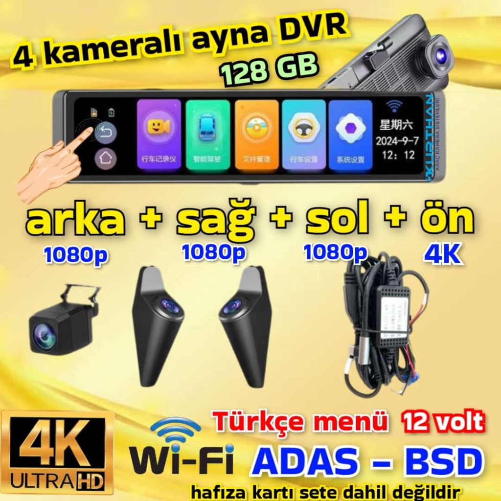 4 KAMERALI DVR AYNA MONİTÖR 128 GB * 12 VOLT * ADAS-BSD