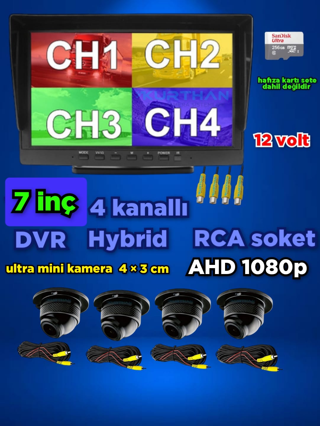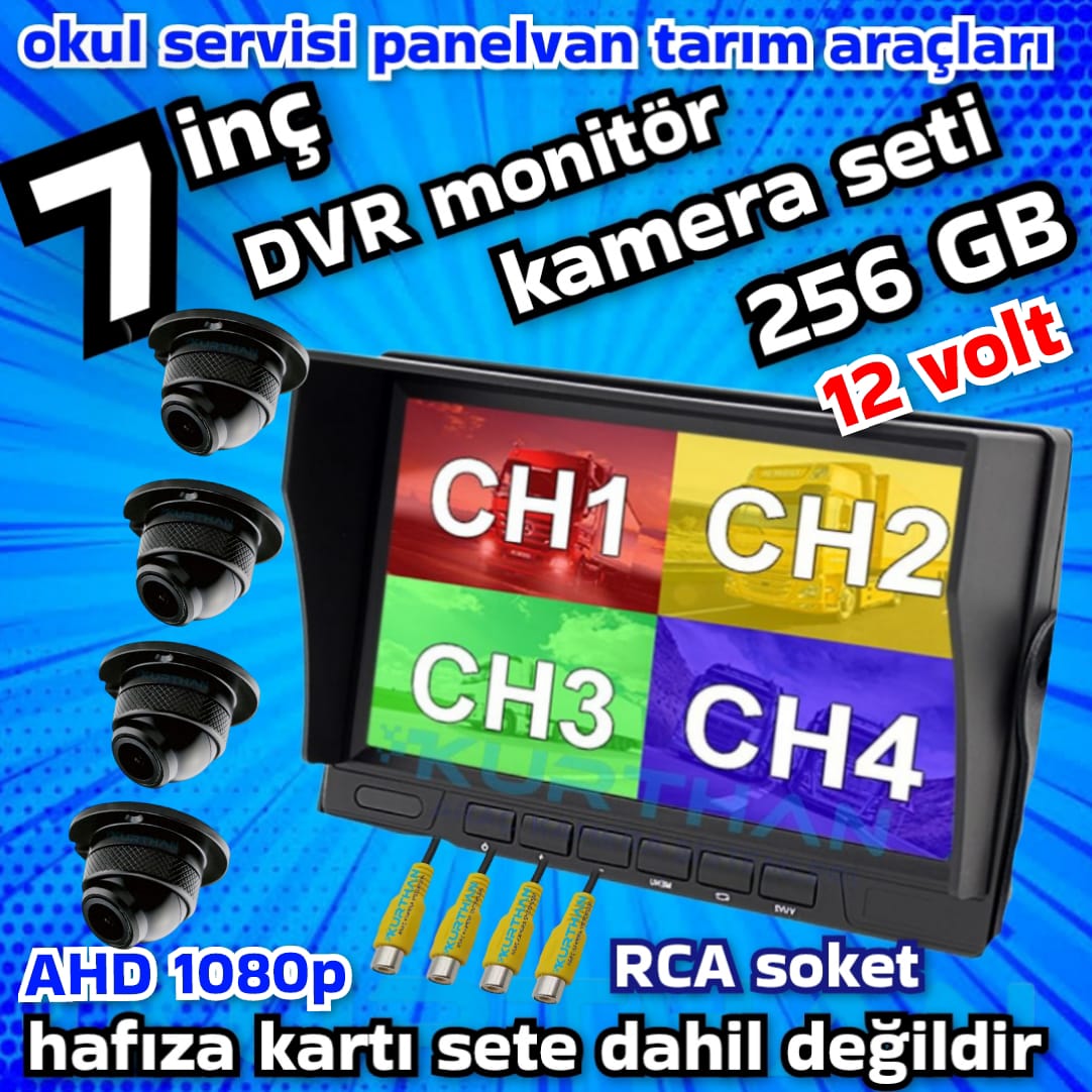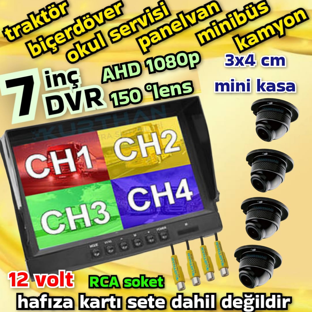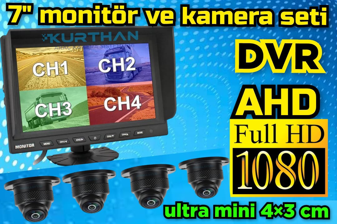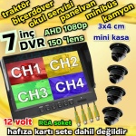 4 ADET 150 DERECE ULTRA MİNİ AHD 1080P METAL KASA KAMERA 7 İNÇ DVR MONİTÖR SETİ 12 VOLT 256 GB